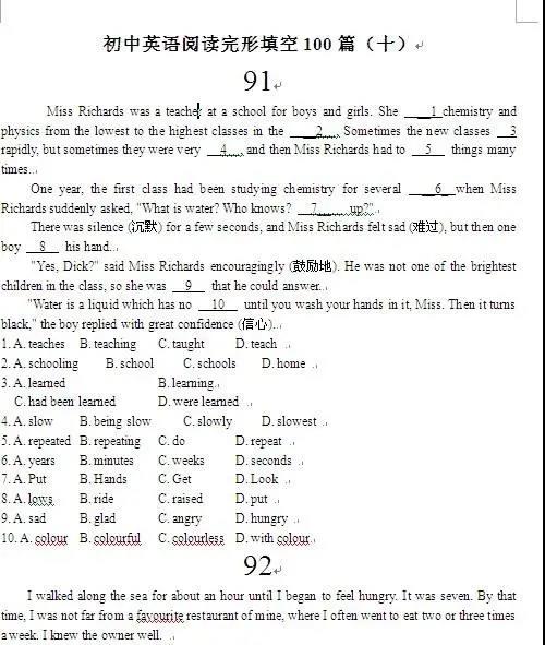 完形填空文章很多时候是围绕一个话题展开,每个段落有的时候发展模式都是差不多的,前面提到如果首句设空,除了关注到后面的例子,还不妨可以关注下一段首句或者再下下段首句。类似的如果某段末句设空不妨也可以关注一下下面一段的末句。
